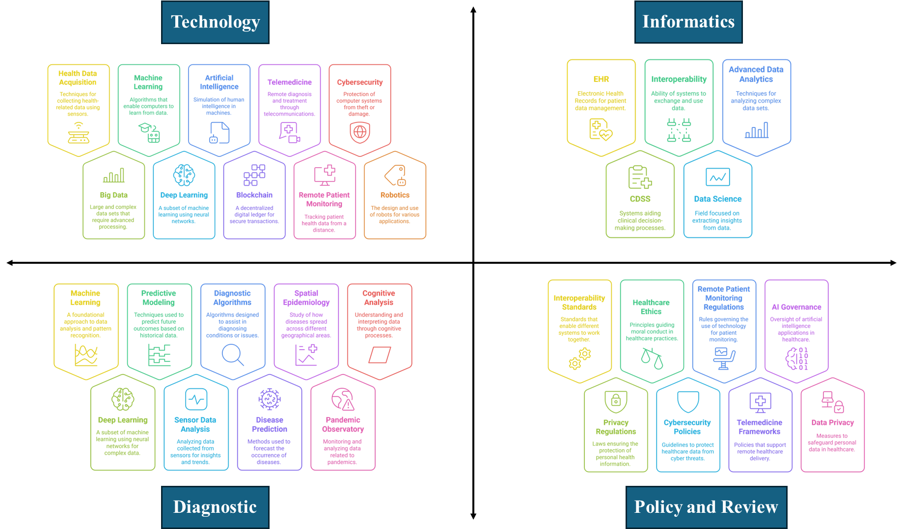 Sensor-Based Health Data Acquisition, Big Data, Machine Learning, Deep Learning, Artificial Intelligence, Blockchain, Telemedicine, Remote Patient Monitoring, Cybersecurity, Robotics, Electronic Health Records (EHR), Clinical Decision Support Systems (CDSS), Interoperability, Data Science, Advanced Data Analytics, Predictive Modeling, Diagnostic Algorithms, Disease Prediction, Sensor Data Analysis, Spatial Epidemiology, Cognitive Analysis, Privacy Regulations (HIPAA, GDPR), Healthcare Ethics, Cybersecurity Policies, Remote Patient Monitoring Regulations, Policy Frameworks for Telemedicine, AI in Healthcare Governance, Data Privacy and Security